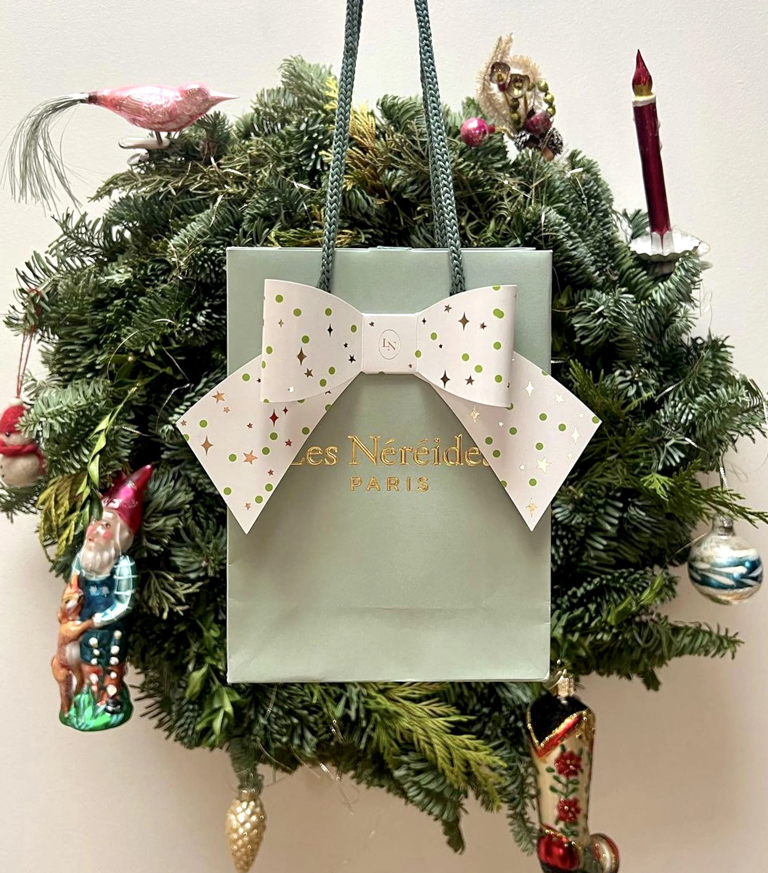 This festive 3D paper ribbon design was created as a sticker-type decoration for Les Néréides’ holiday shopping bags, adding an elegant and refined touch to seasonal packaging. Designed for efficiency and easy assembly, the ribbon features a delicate hand-drawn pattern of gold sparkles and green dots on a light ivory background, reminiscent of lace-inspired holiday ornaments. The soft, rounded edges enhance femininity and sophistication, transforming each shopping bag into a memorable gift-like experience that elevates the unboxing and gifting moment.